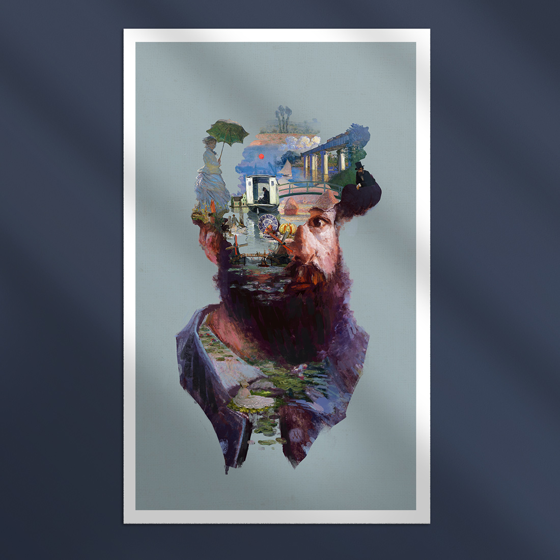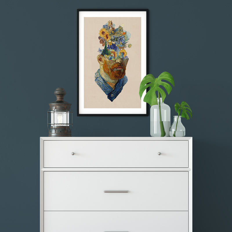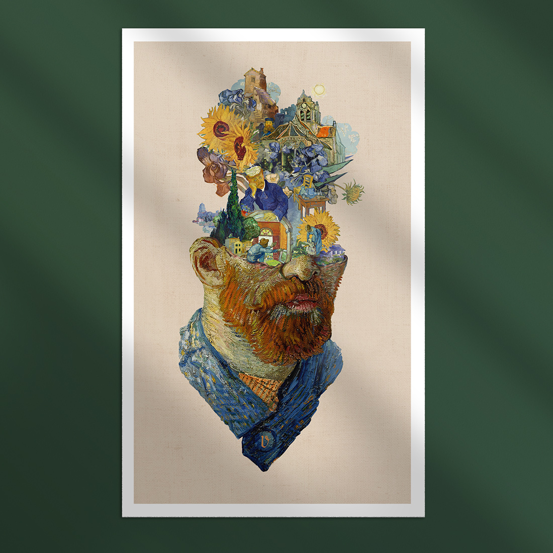 What does the mind of an artist look like? What stories, interests or obsessions are hiding in the work of the masters, and can you find them in their work? This idea fueled this series of three artworks. In search of the story behind the artist. A look inside the minds of Van Gogh, Gauguin and Monet. Made as a collage of the artists original work, from the public domain. These Giclée prints sized at 50 x 30 CM are printed on museum quality Hahnemühle cotton-paper. This way we can ensure the highest quality and depth of color.